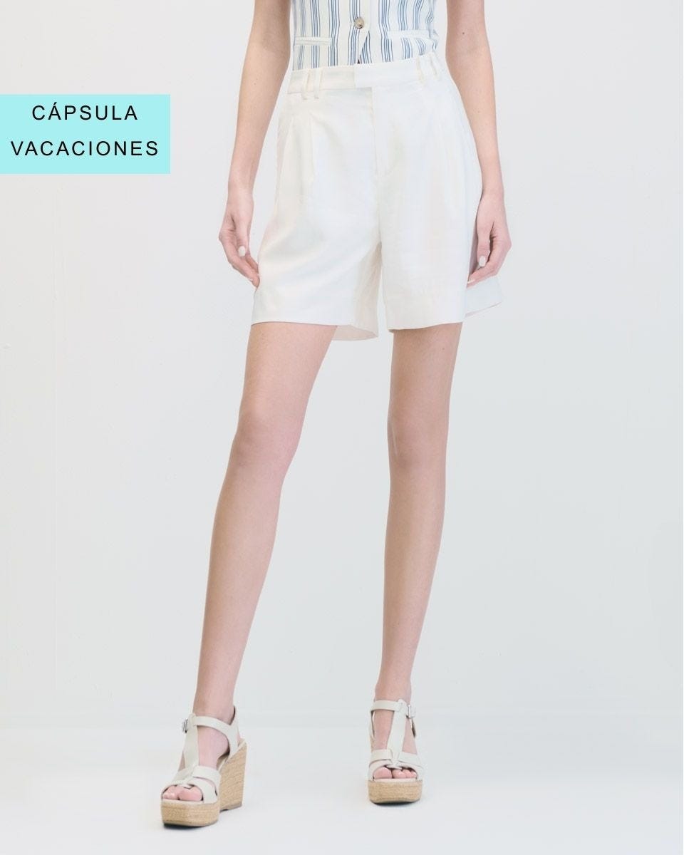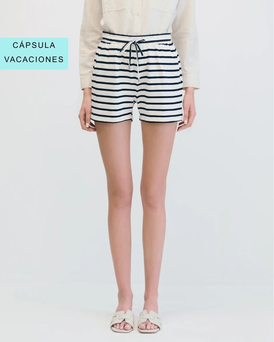 Short Beige De Lino Tiro Alto A Rayas
