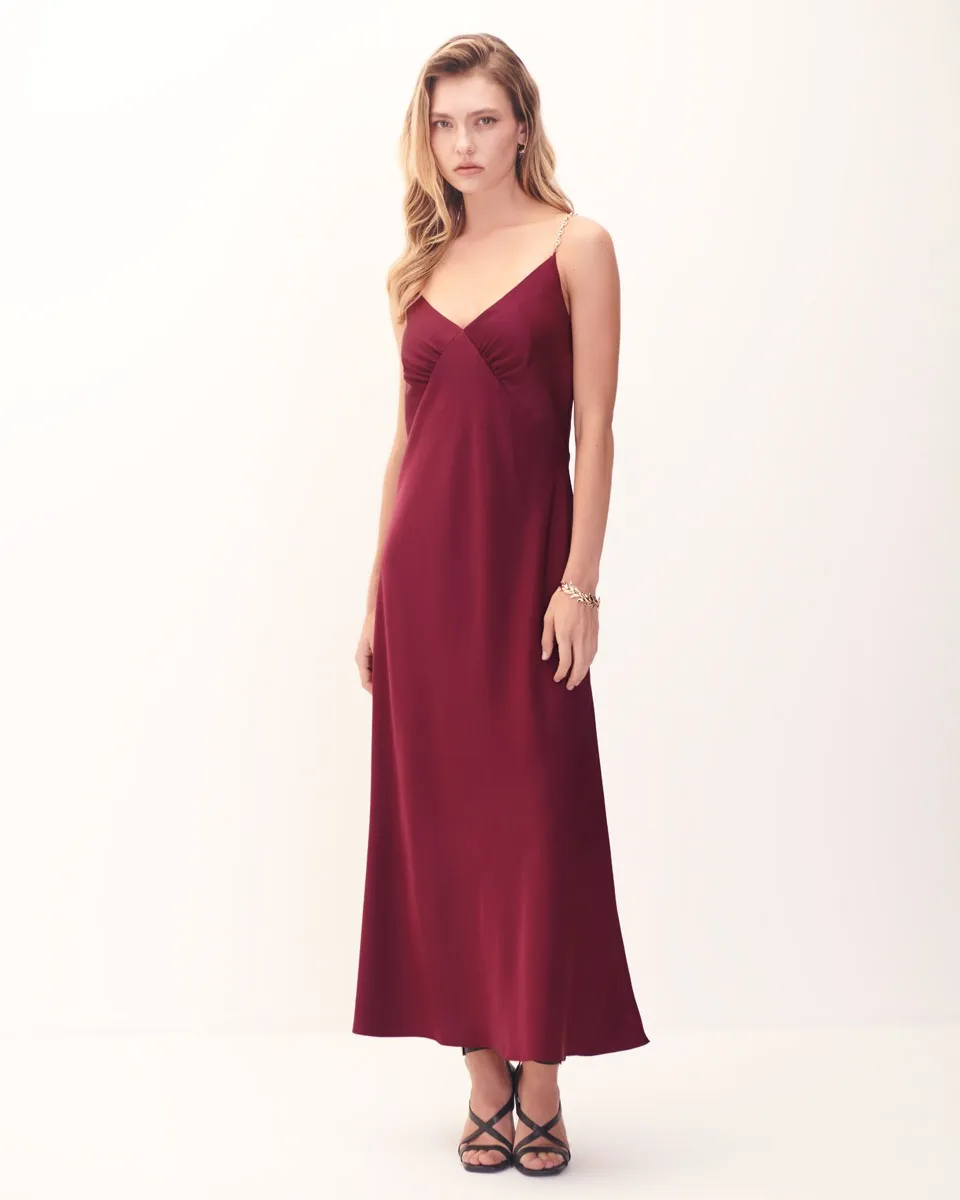 Vestido De Fiesta Satín Vino Corte Imperio Tirante Cadena