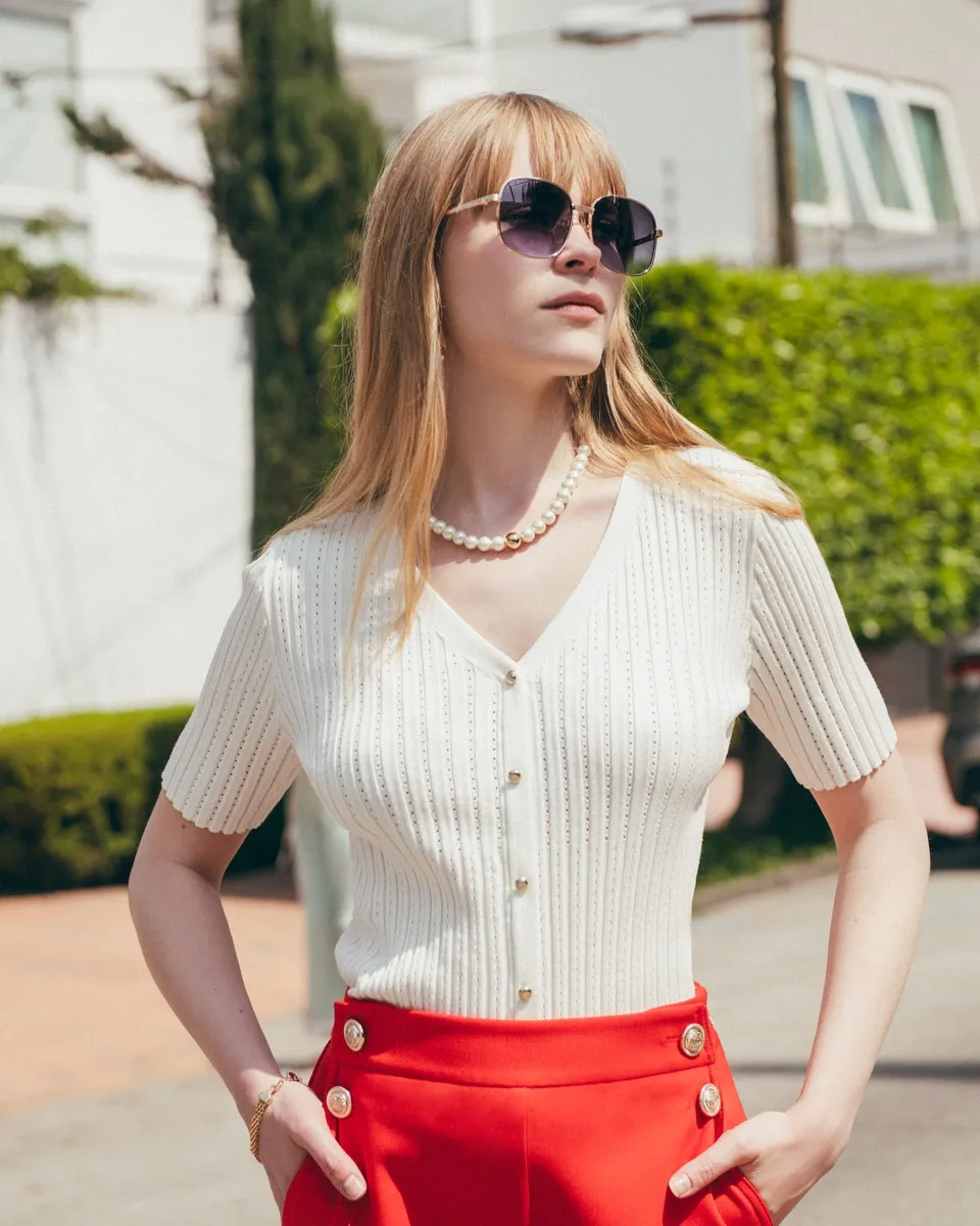 Blusa Tejido Canalé Blanca Escote V Manga corta