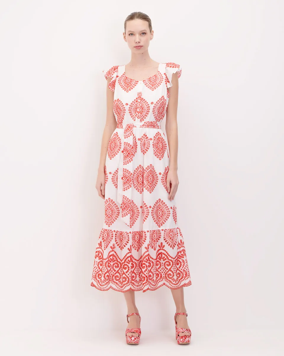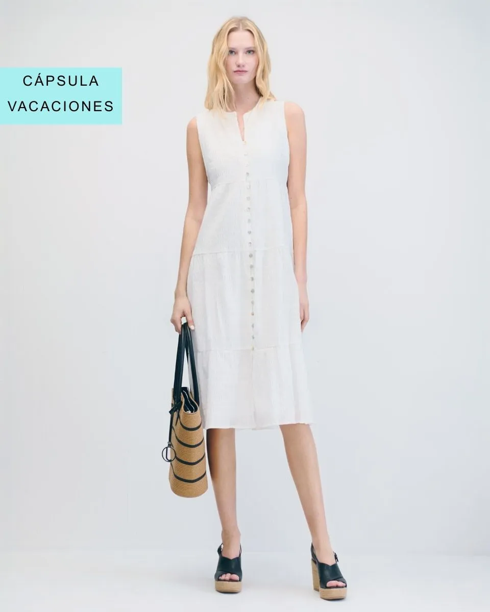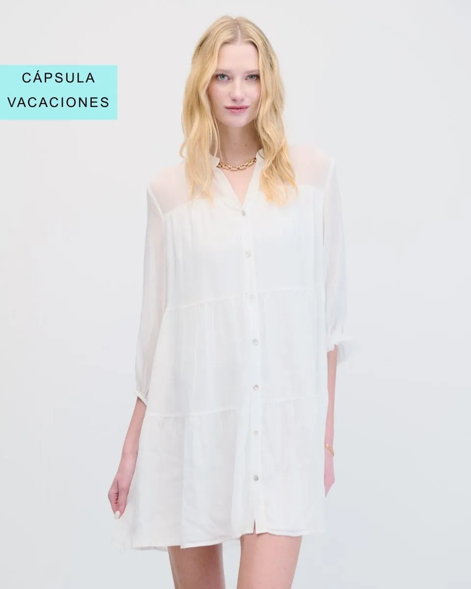 Vestido Blanco Bordado Fit And Flare Escote V Manga 3/4