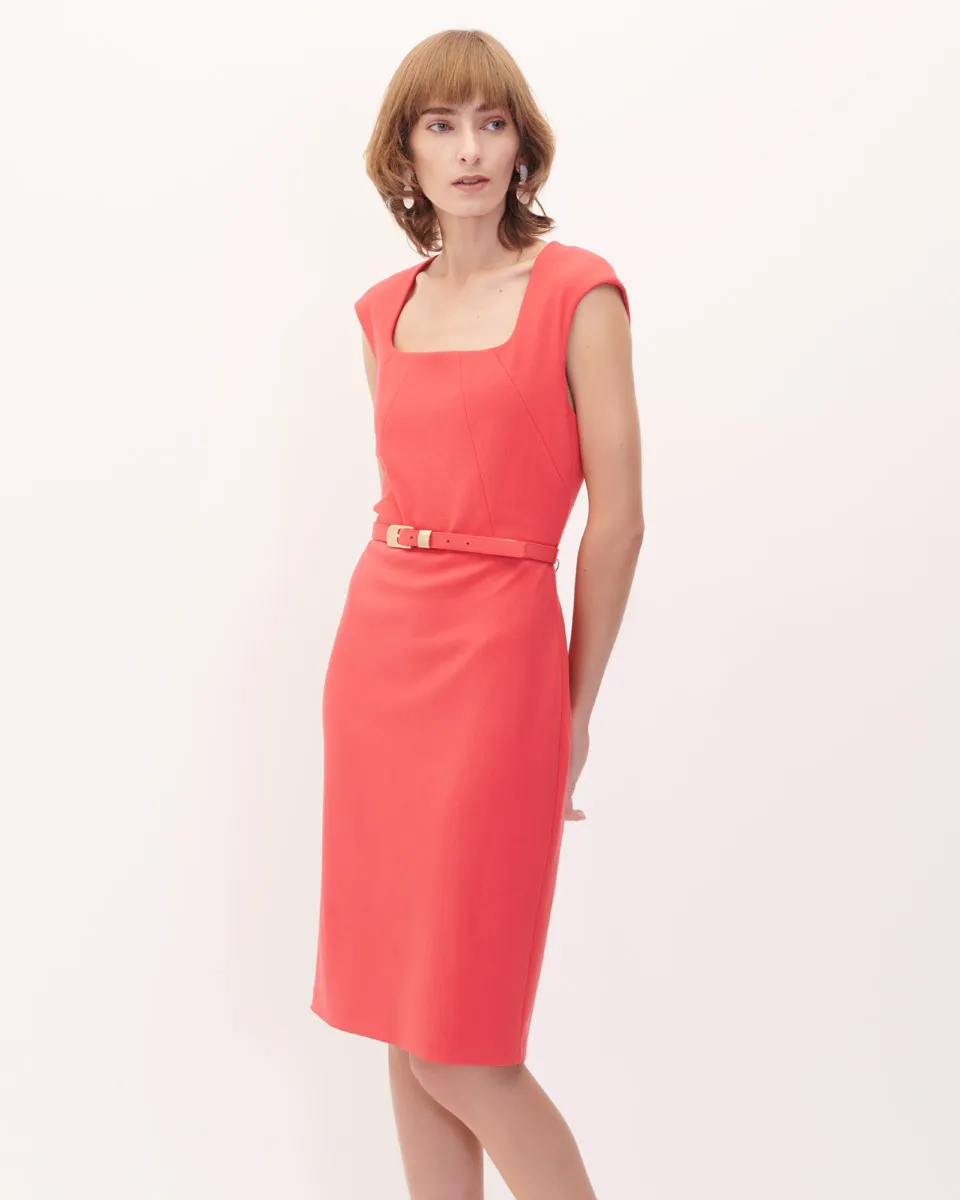 Vestido Rosa Entallado Escote Cuadrado Y Cinturón