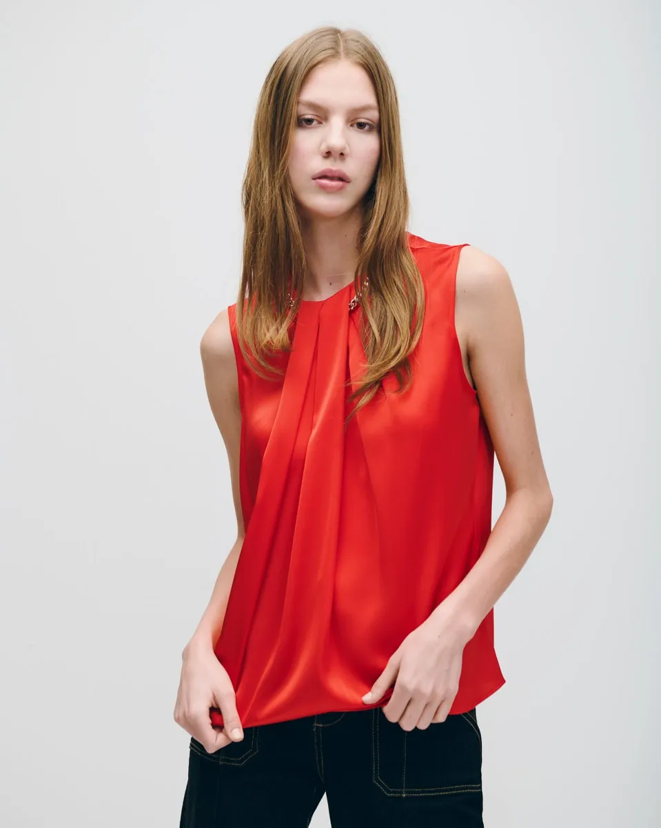 Blusa De Satín Rojo Escarlata Cadena En Cuello Y Alforzas