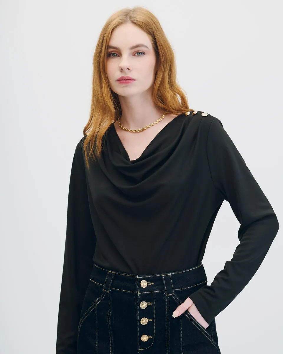 Blusa Negra De Punto Escote Drapeado Botones En Hombro