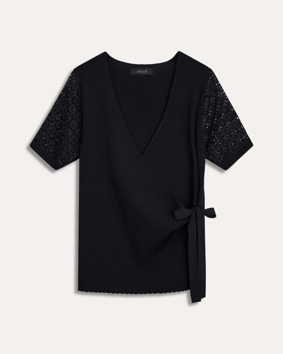 Blusa Negra De Punto Envolvente Manga Bordada