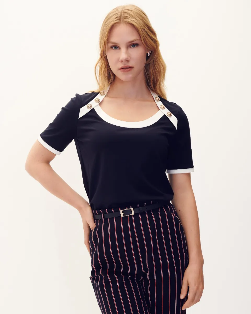 Blusa De Punto Azul Marino Ribetes En Contraste