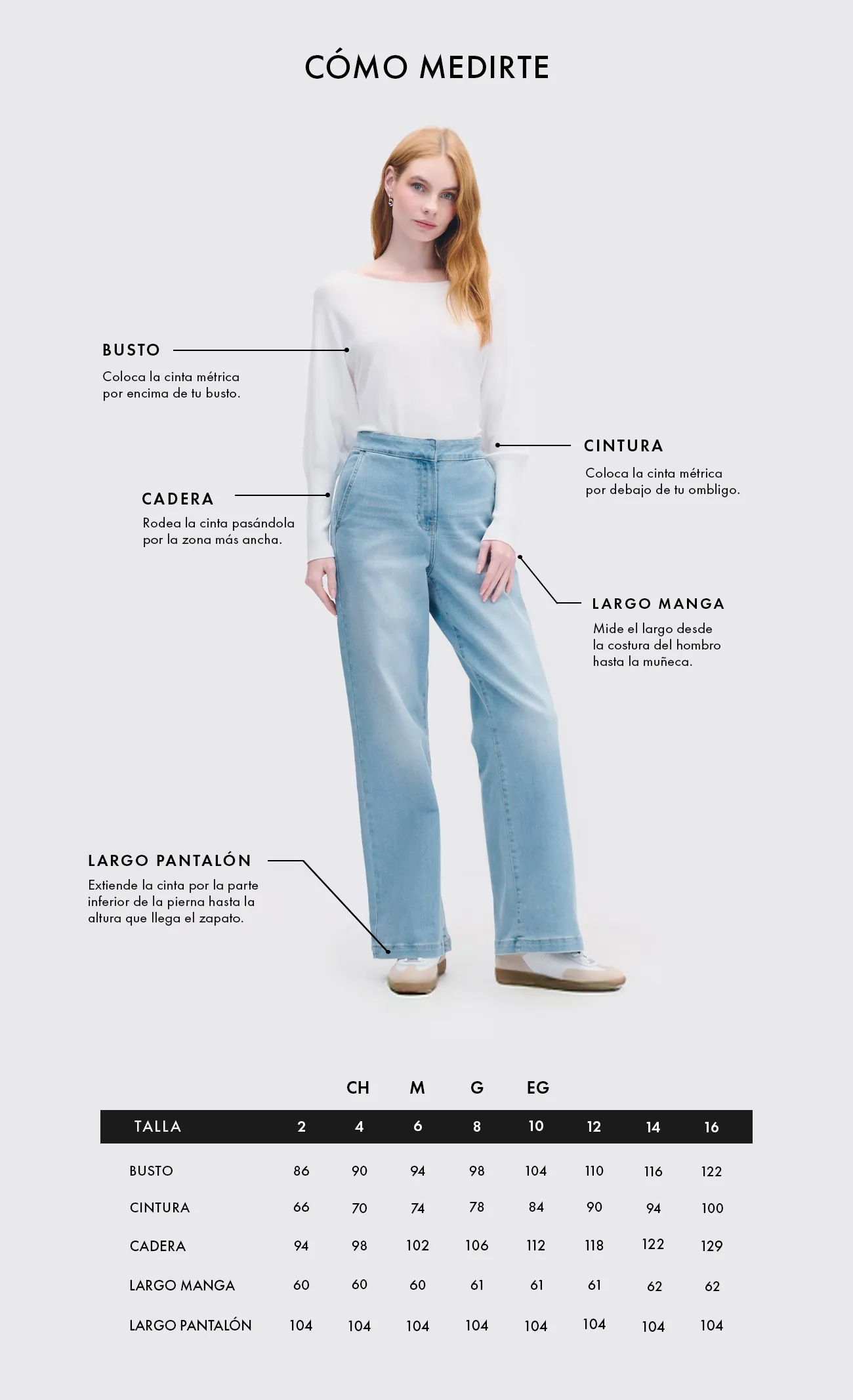 La medida más importante para estos tipos de prendas es la cintura. Asegúrate de que la cintura se ajuste correctamente y considera la longitud deseada.