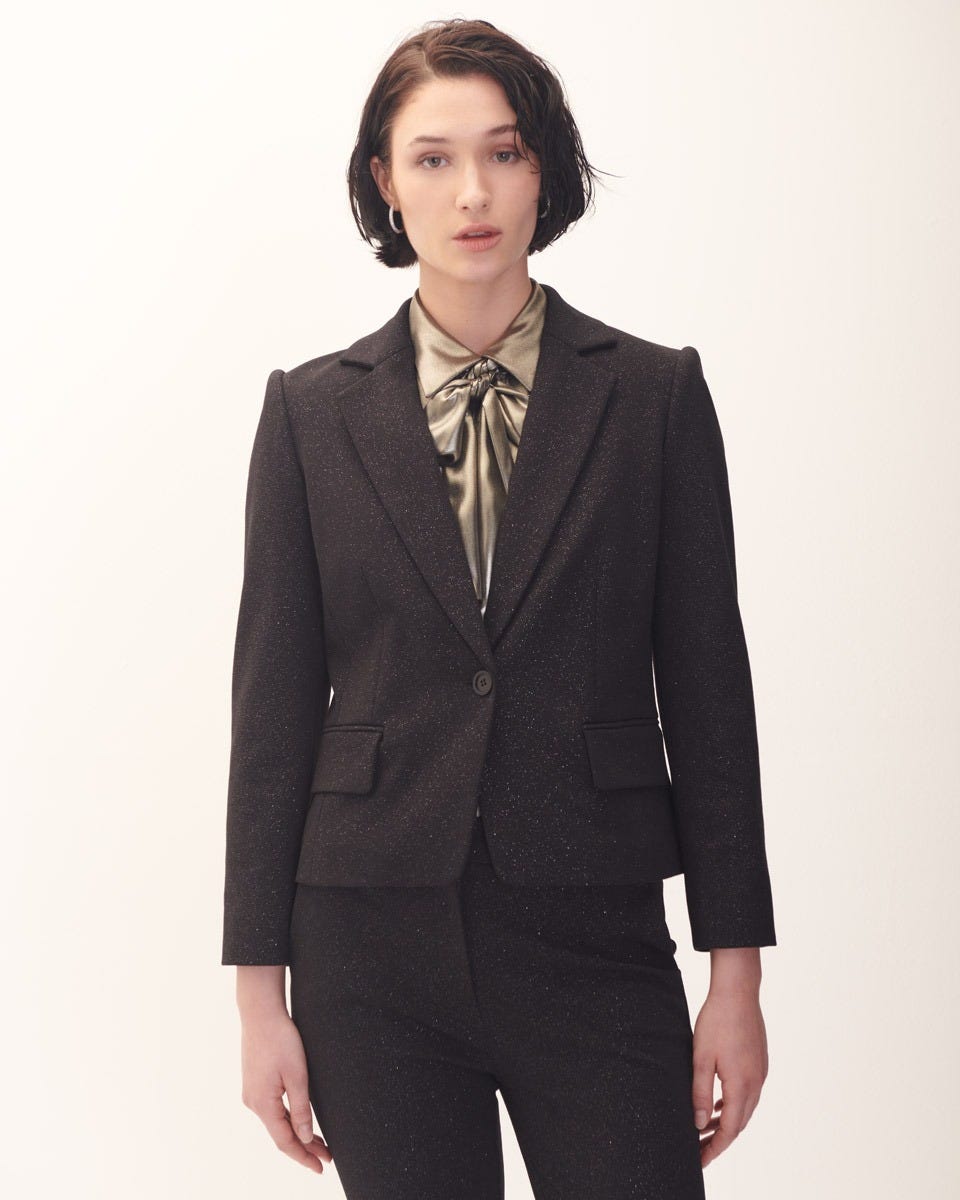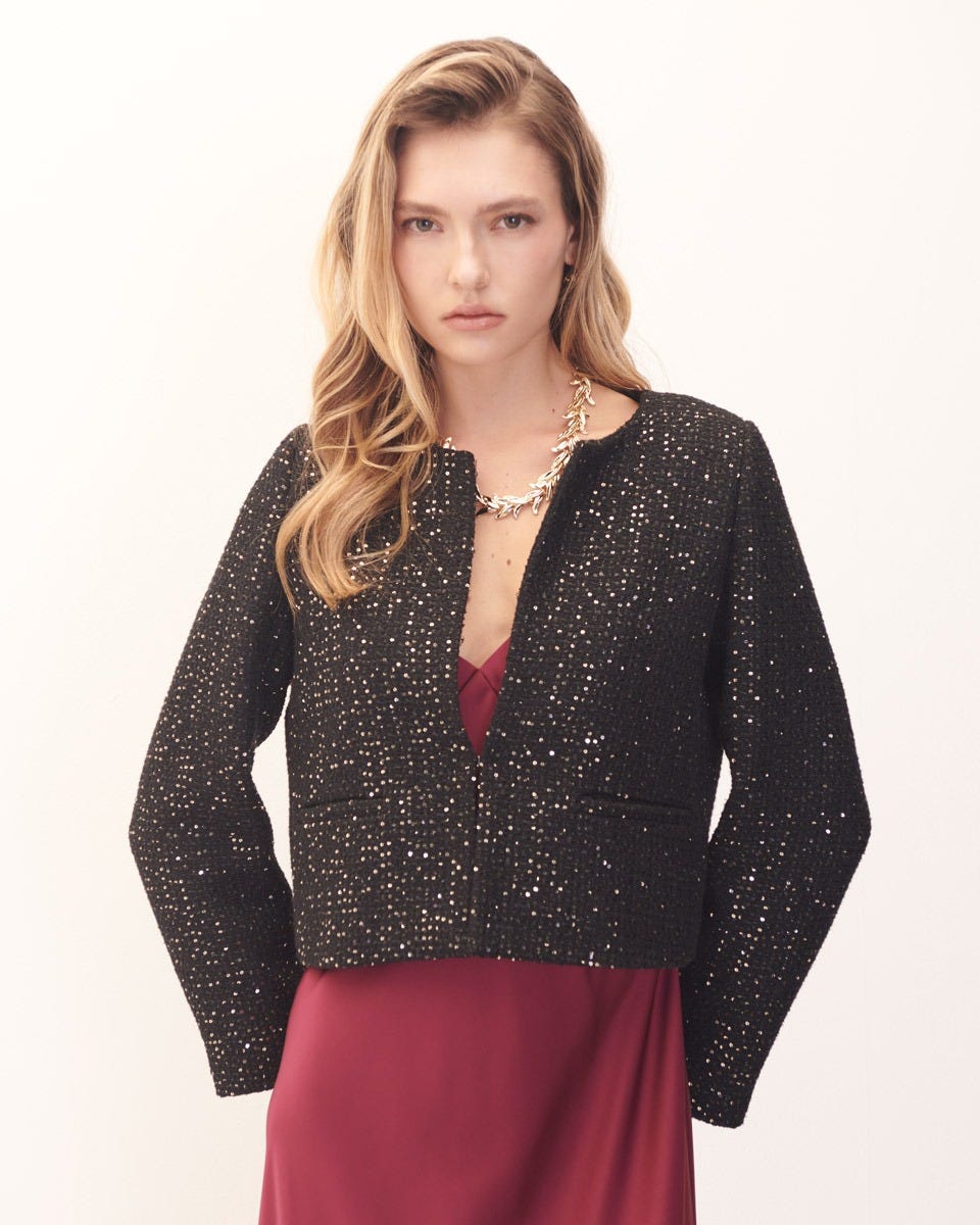 Saco Corto Negro De Tweed Con Lentejuela Dorada