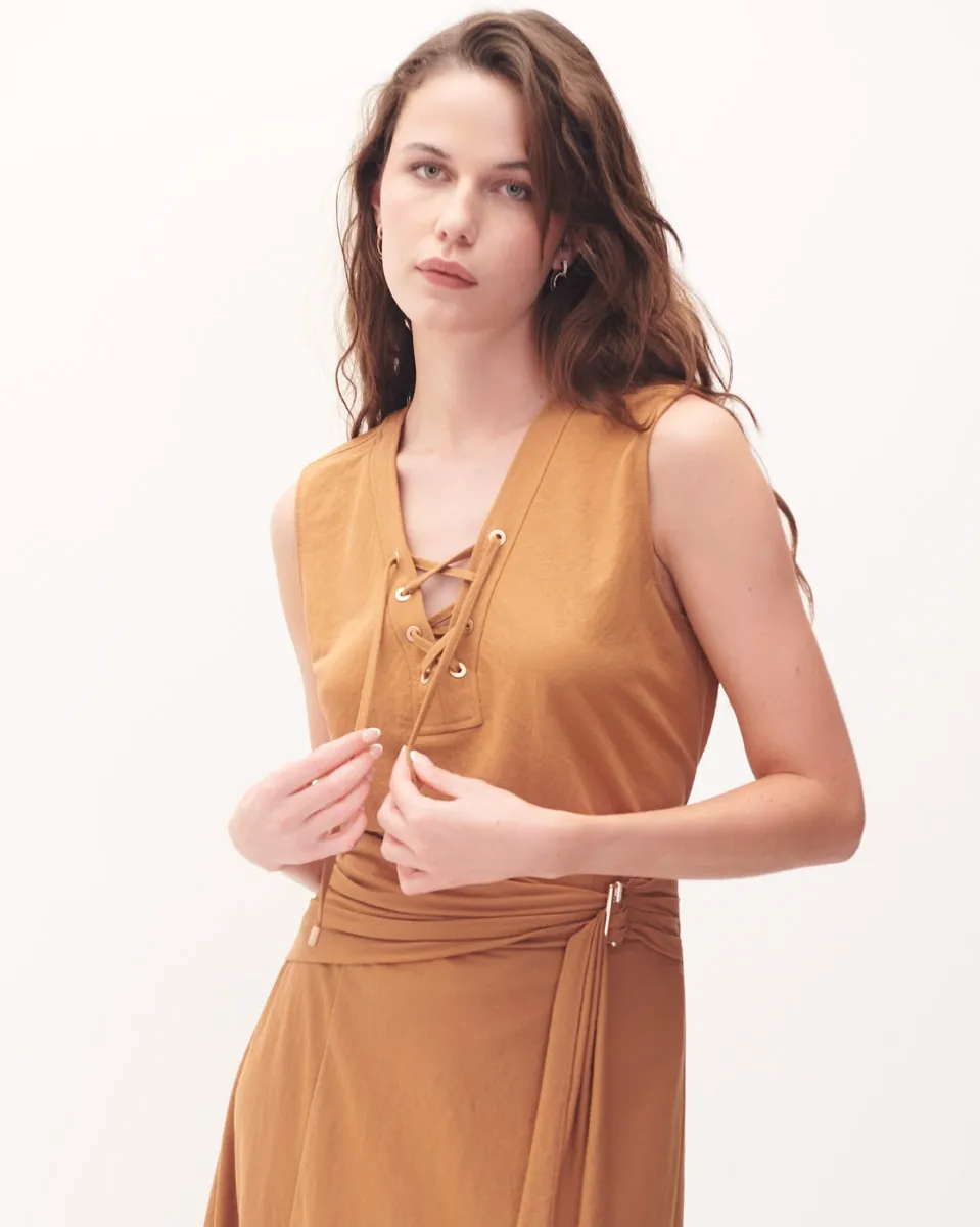 Blusa Canela Sin Mangas Escote V Ojillos Y Jaretas