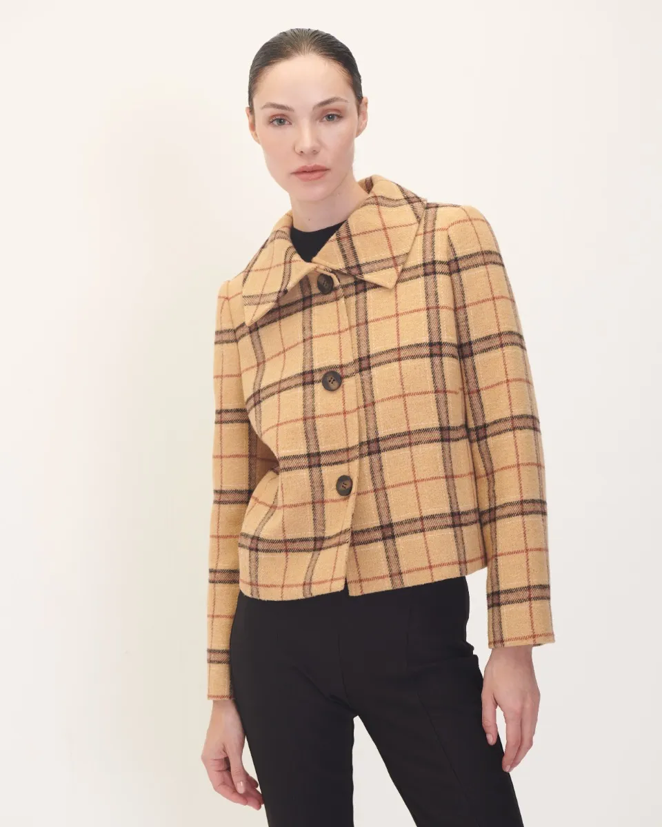 Abrigo Trenca De Paño A Cuadros Avellana Cuello Alto