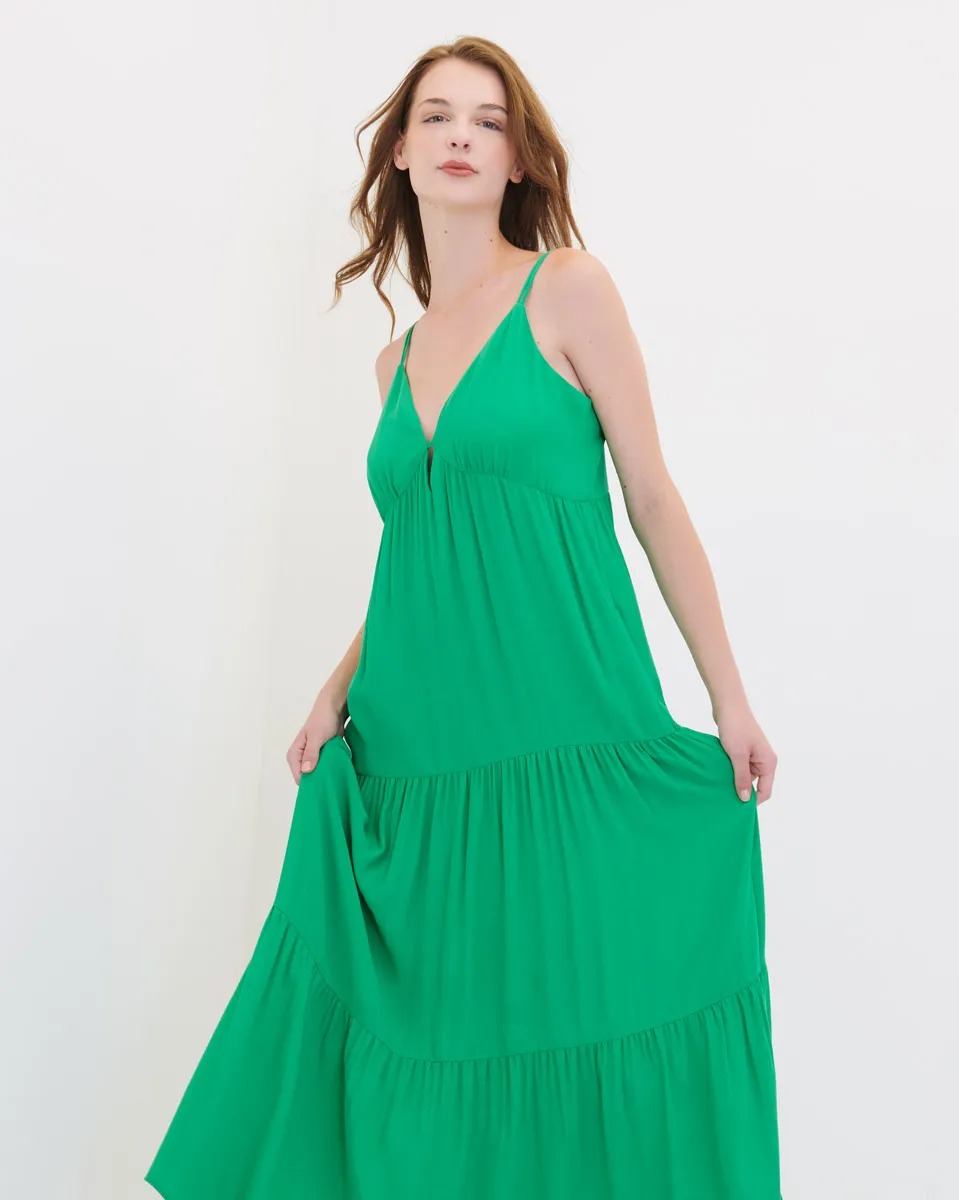 Maxi Vestido Verde Trébol Estampado Mediterráneo Escote V Y Cinturón