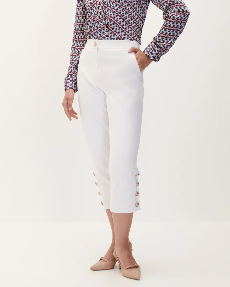 Pantalón Recto Tiro Alto Blanco De Jacquard Botones Dorados