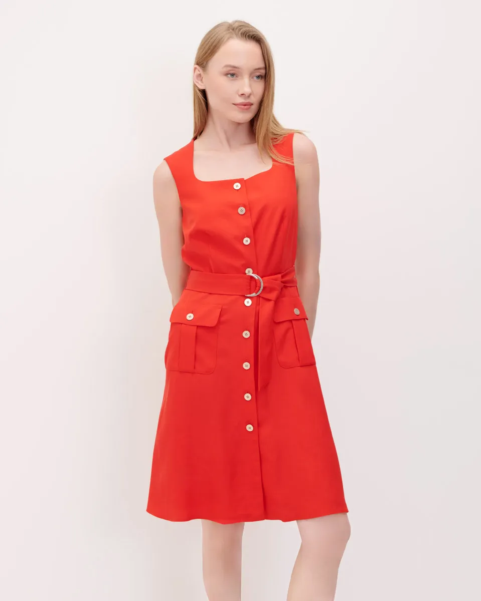 Vestido Rojo De Punto Línea A Cuello Alto Alforzas Y Cinturón